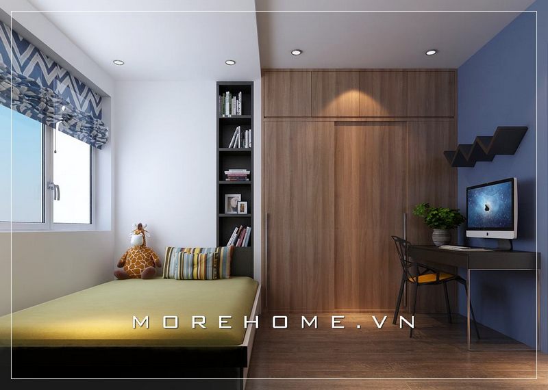 Tủ quần áo có thiết kế hiện đại, cánh lùa tiện dụng và âm tường kịch trần được lựa chọn để trang trí phòng ngủ của bé trai.